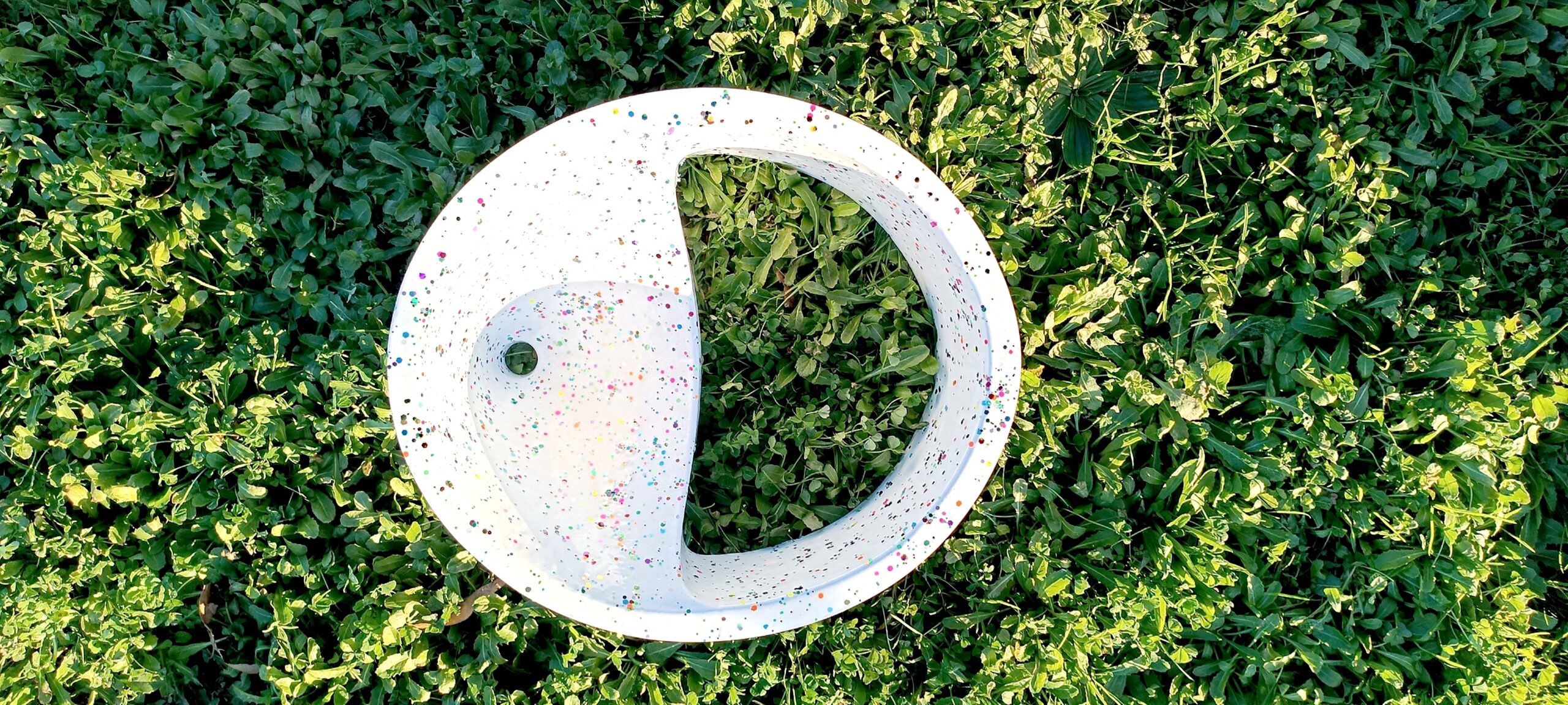 - un revêtement final en résine époxy de qualité professionnelle (~80g) en trois couches : l’une de couleur, deux autres de vernis incolore qui lui donne sa brillance, sa glisse et, au passage sa profondeur visuelle finale. Les paillettes, feuilles d’or et autres, sont incorporées à la main sur la première couche et noyées sous les suivantes.